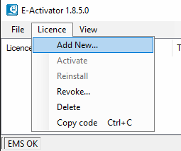 Open the E-Activator on the Wincaps PC that requires a licence and select Add New from the Licence options: